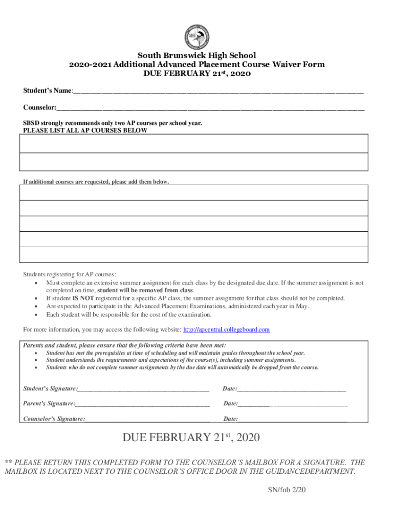 South Brunswick High School 20202021 Additional Advanced Placement Course Waiver Form DUE FEBRUARY 21st, 2020 Students Name: Counselor: BSD strongly recommends only two AP courses per school year.