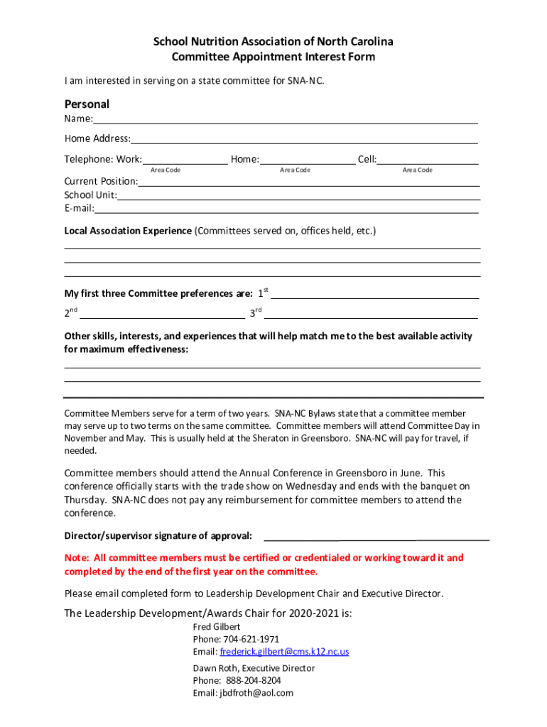 School Nutrition Association of North Carolina Committee Appointment Interest Form I am interested in serving on a state committee for SPANC. Personalize: Home Address: Telephone: Work: Home: Cell: