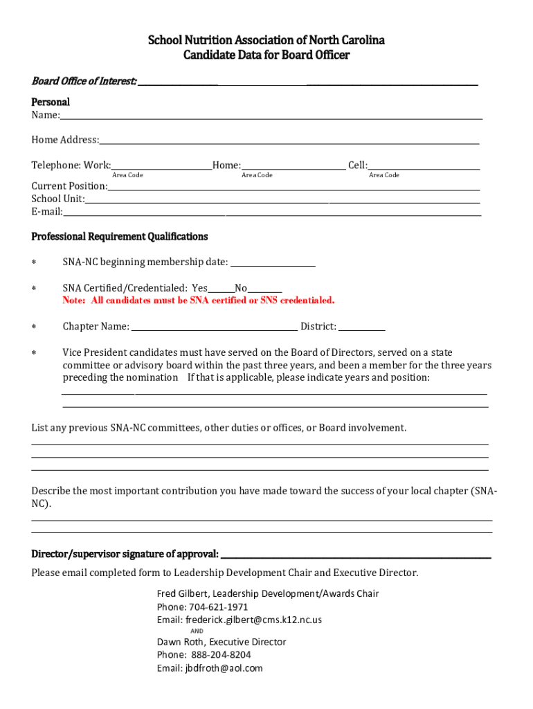 School Nutrition Association of North Carolina Candidate Data for Board Fiberboard Office of Interest: Personal Name: Home Address: Telephone: Work: Home: Cell: Area Covered Concurrent Position: School