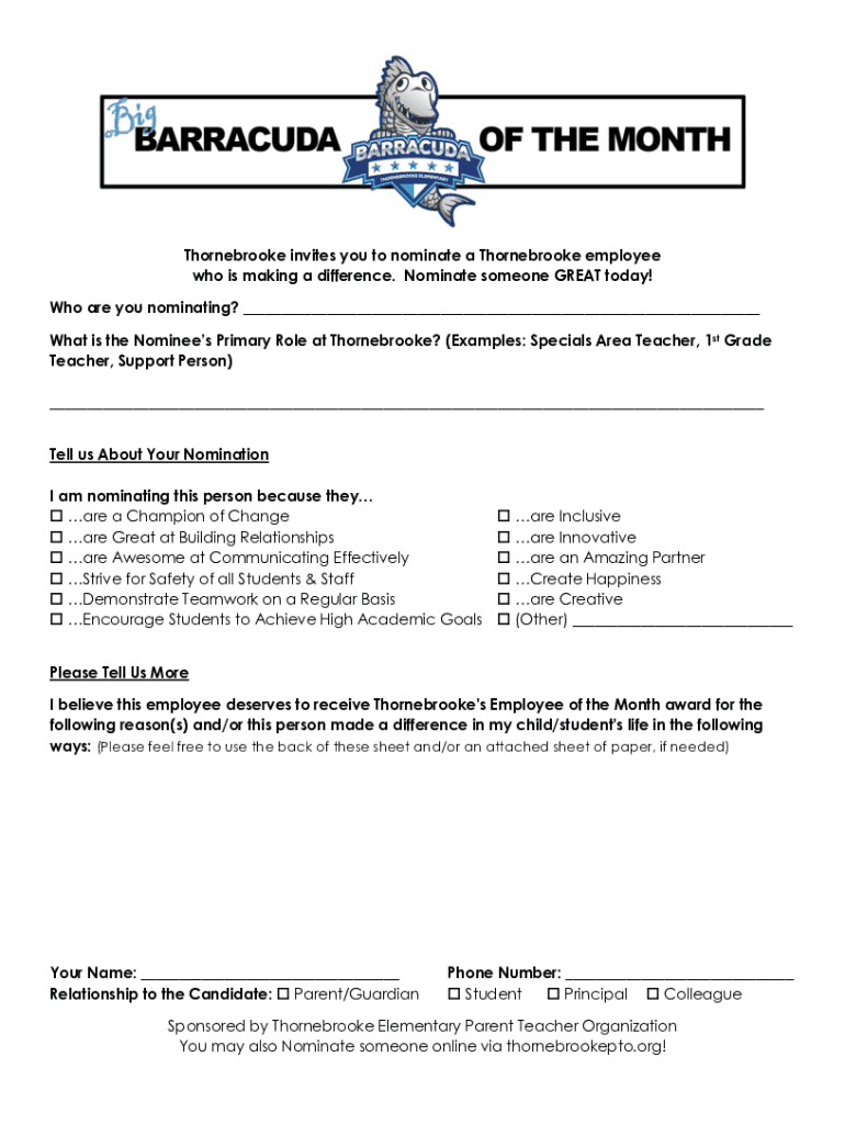 Get the free Thornebrooke invites you to nominate a Thornebrooke employee ...