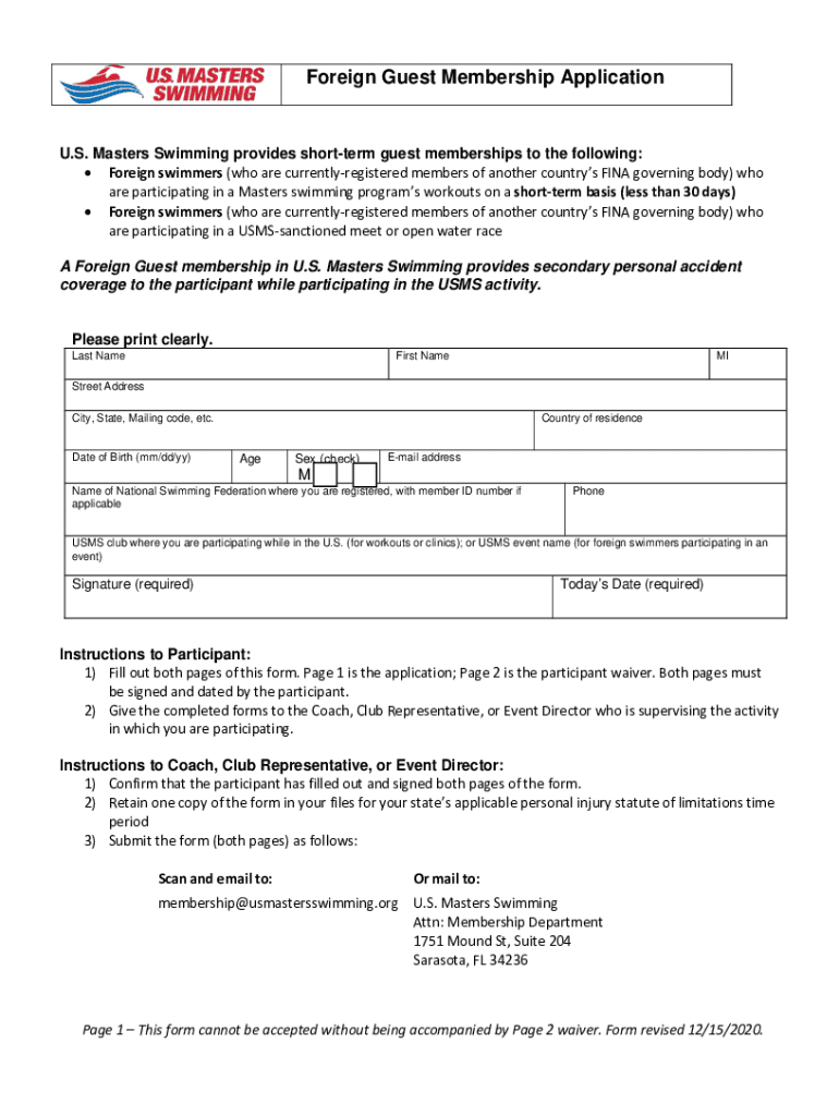Foreign Guest Membership Application. S. Masters Swimming provides short term guest memberships to the following: Foreign swimmers (who are currently registered members of another countries FINA governing