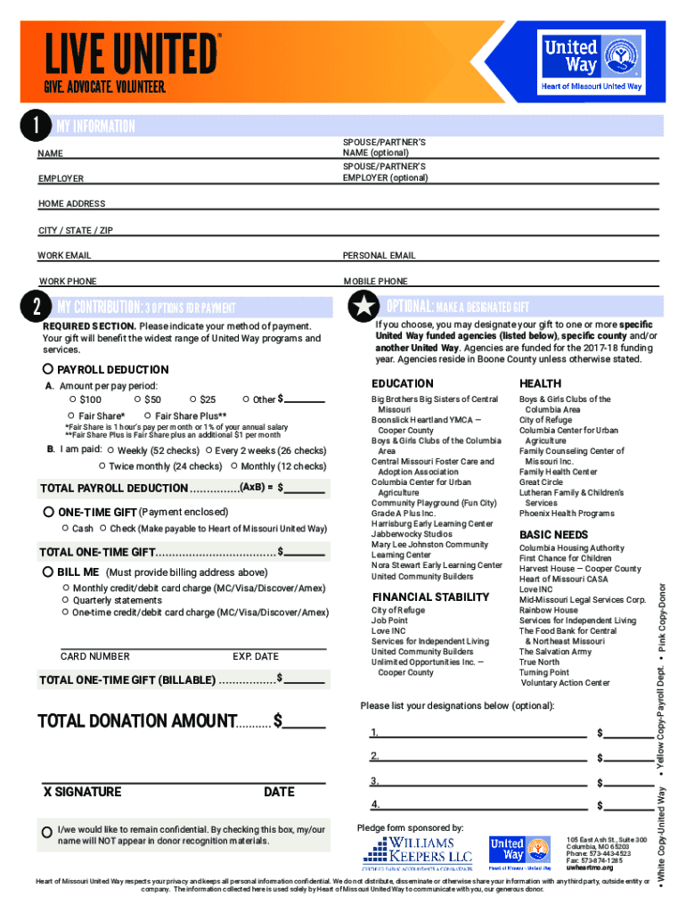 LIVE UNITEDGIVE. ADVOCATE. VOLUNTEER.1MY INFORMATIONSPOUSE/PARTNERS NAME (optional) SPOUSE/PARTNERS EMPLOYER (optional)NAME EMPLOYER HOME ADDRESS CITY / STATE / ZIP WORK EMAILPERSONAL METALWORK PHONEMICIZE