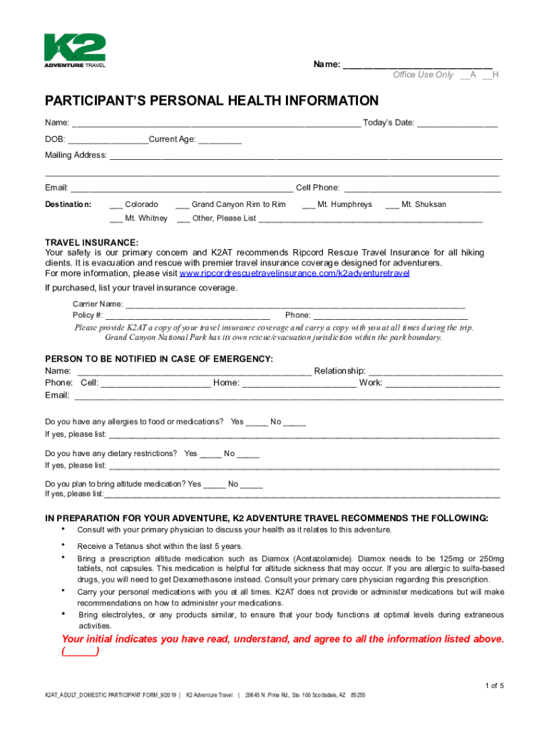 ! Name: Office Use Only A PARTICIPANTS PERSONAL HEALTH INFORMATION Name: Today's Date: DOB: Current Age: Mailing Address: Email: Cell Phone: Destination: Mt. Humphreys Mt. Susan Colorado Grand Canyon
