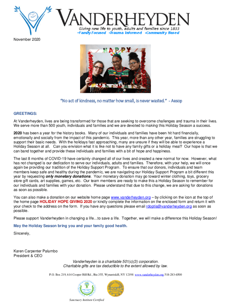 November 2020No act of kindness, no matter how small, is never wasted. Aesop GREETINGS: At Vanderheyden, lives are being transformed for those that are seeking to overcome challenges and trauma in