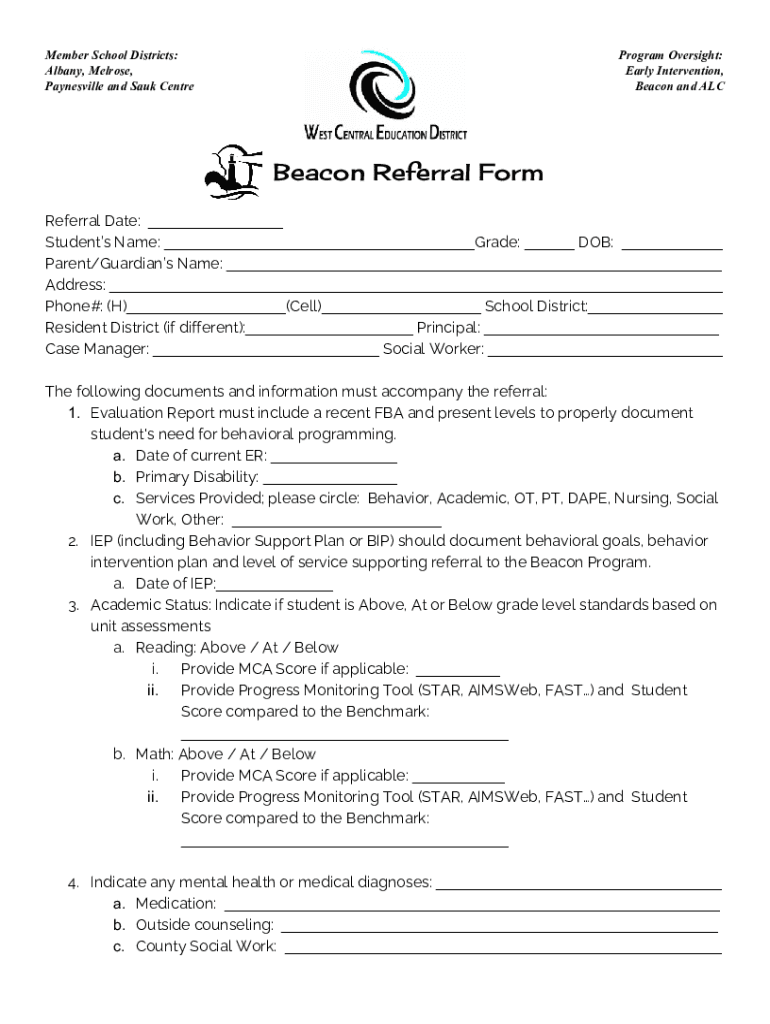 Member School Districts: Albany, Melrose, Painesville and Sank CentreProgram Oversight: Early Intervention, Beacon and Beacon Referral Form Referral Date: Students Name: Grade: DOB: Parent/Guardians