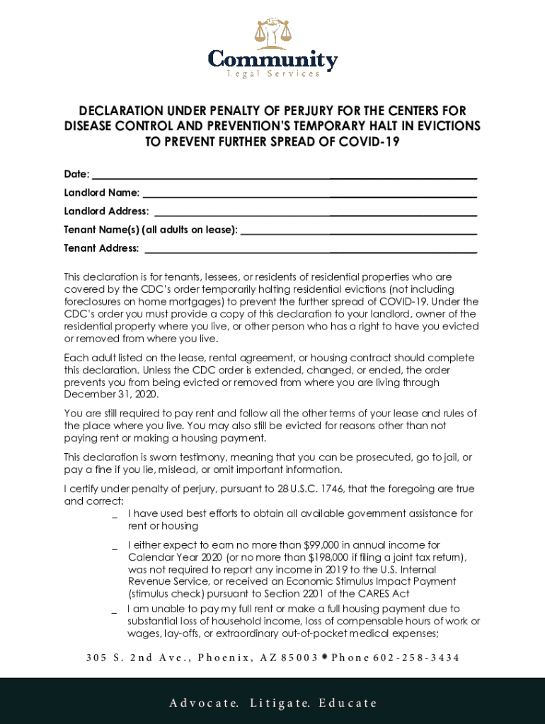 DECLARATION UNDER PENALTY OF PERJURY FOR THE CENTERS FOR DISEASE CONTROL AND PREVENTIONS TEMPORARY HALT IN EVICTIONS TO PREVENT FURTHER SPREAD OF COVID-19 Date: Landlord Name: Landlord Address: Tenant