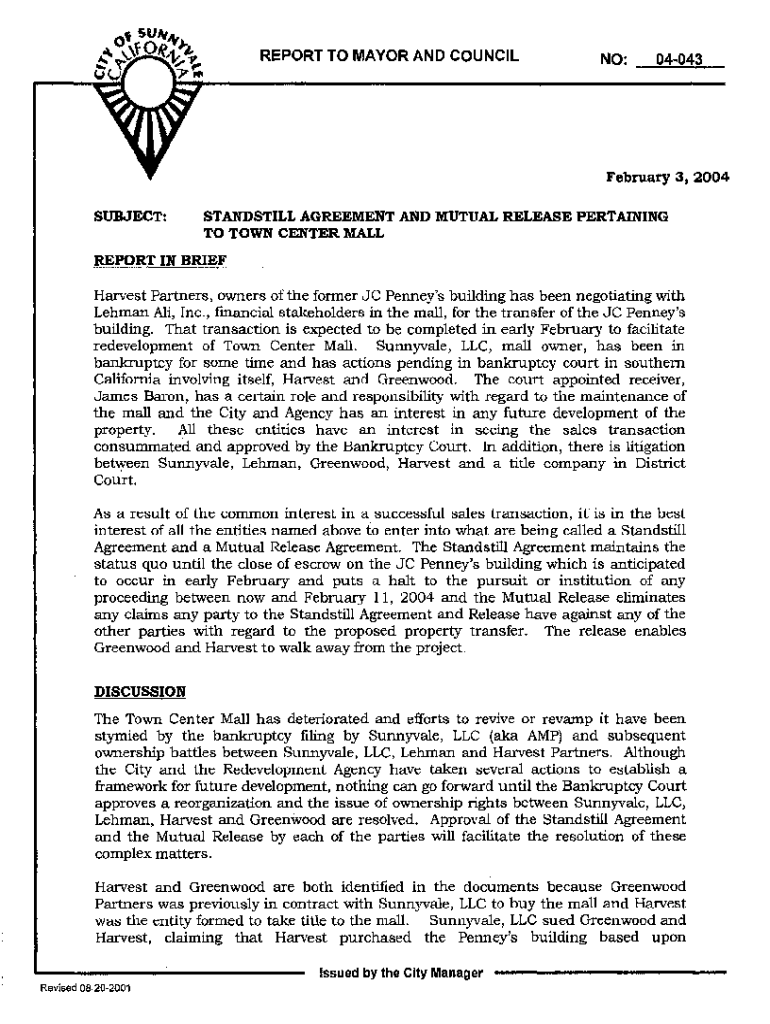 REPORT TO MAYOR AND COUNCIL NO:04043February 3, 2004SUBJECT:STANDSTILL AGREEMENT AND MUTUAL RELEASE PERTAINING