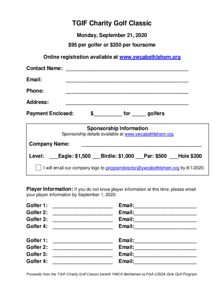 TGIF Charity Golf Classic Monday, September 21, $202095 per golfer or $350 per foursome Online registration available at www.ywcabethlehem.org Contact Name: Email: Phone: Address: Payment Enclosed:$