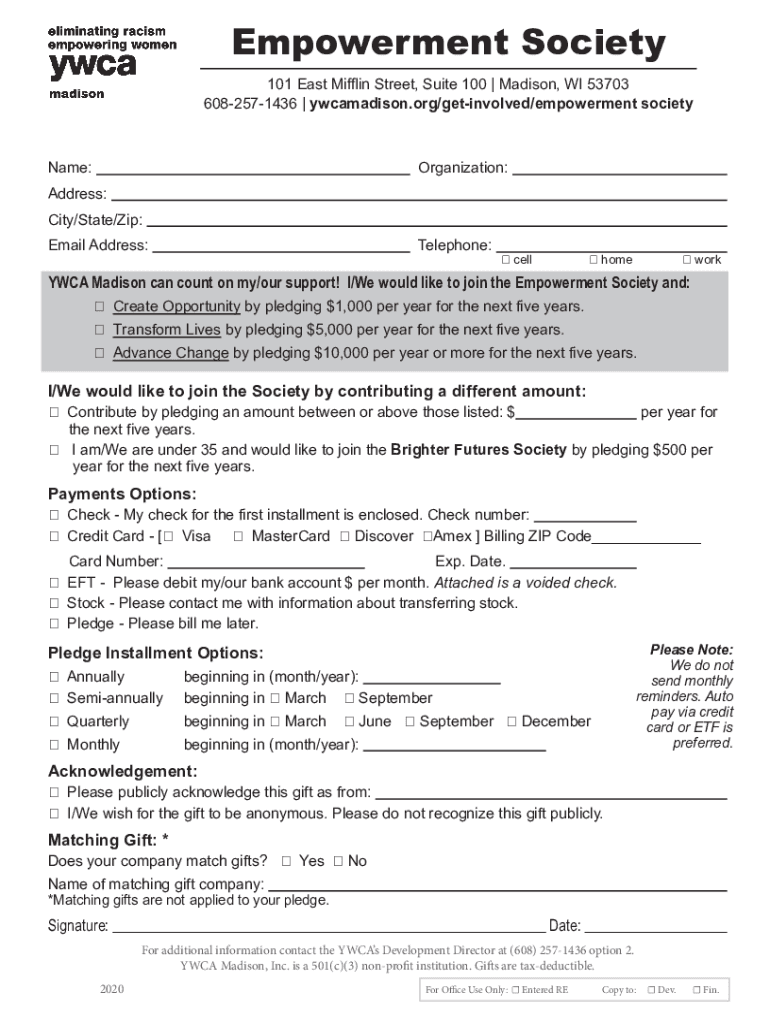Empowerment Society 101 East Mifflin Street, Suite 100 Madison, WI 53703 6082571436 ywcamadison.org/getinvolved/empowerment societyName:Organization:Address:City/State/Zip:Email Address:Telephone: