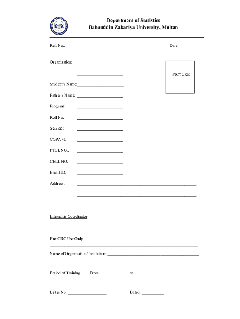 Department of Statistics Aladdin Bavaria University, Multan Ref. No.:Organization:Date: PICTUREStudents Name: Fathers Name: Program: Roll No. Session: CGPA %: PTC NO.: CELL NO. Email ID: Address: