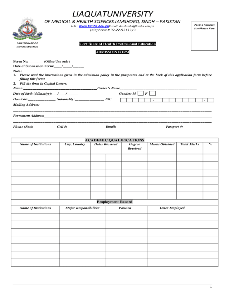 LIAQUATUNIVERSITY OF MEDICAL & HEALTH SCIENCES ASHORE, SINDH PAKISTAN URL: www.lumhs.edu.pkEmail: deludes lumps.edu.telephone # 92229213373DIRECTORATE Paste a Passport Size Picture HereCertificate