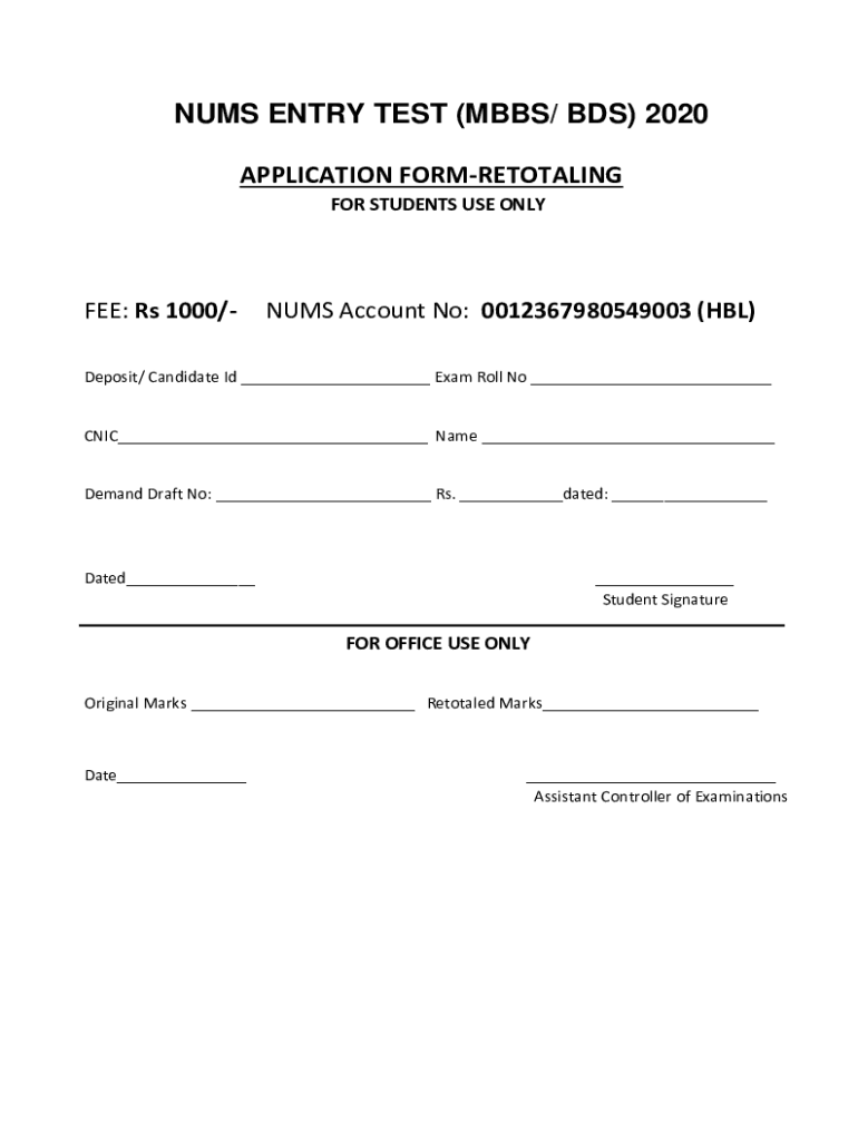 NUNS ENTRY TEST (MBBS/ BDS) 2020 APPLICATION FORMRETOTALING FOR STUDENTS USE ONLY: Rs 1000/NUNS Account No: 0012367980549003 (HBO)Deposit/ Candidate I'd Exam Roll No CNIC Name Demand Draft No: Rs.