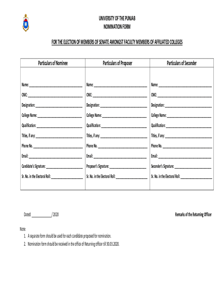 Get the free UNIVERSITY OF THE PUNJAB NOMINATION FORM FOR THE ELECTION ... - pu edu