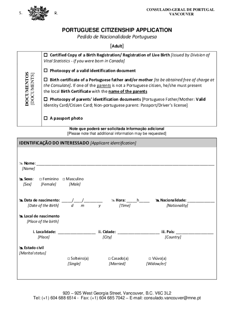 CONSULADOGERAL DE PORTUGAL VANCOUVERPORTUGUESE CITIZENSHIP APPLICATION Period de Nacionalidade Portuguese Adult DOCUMENTS Certified Copy of a Birth Registration/ Registration of Live Birth issued