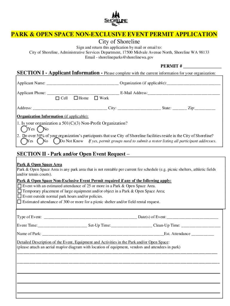 PARK & OPEN SPACE NONEXCLUSIVE EVENT PERMIT APPLICATION City of Shoreline Sign and return this application by mail or email to: City of Shoreline, Administrative Services Department, 17500 Midvale