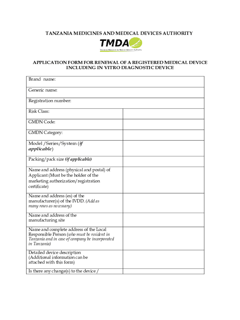 TANZANIA MEDICINES AND MEDICAL DEVICES AUTHORITYAPPLICATION FORM FOR RENEWAL OF A REGISTERED MEDICAL DEVICE