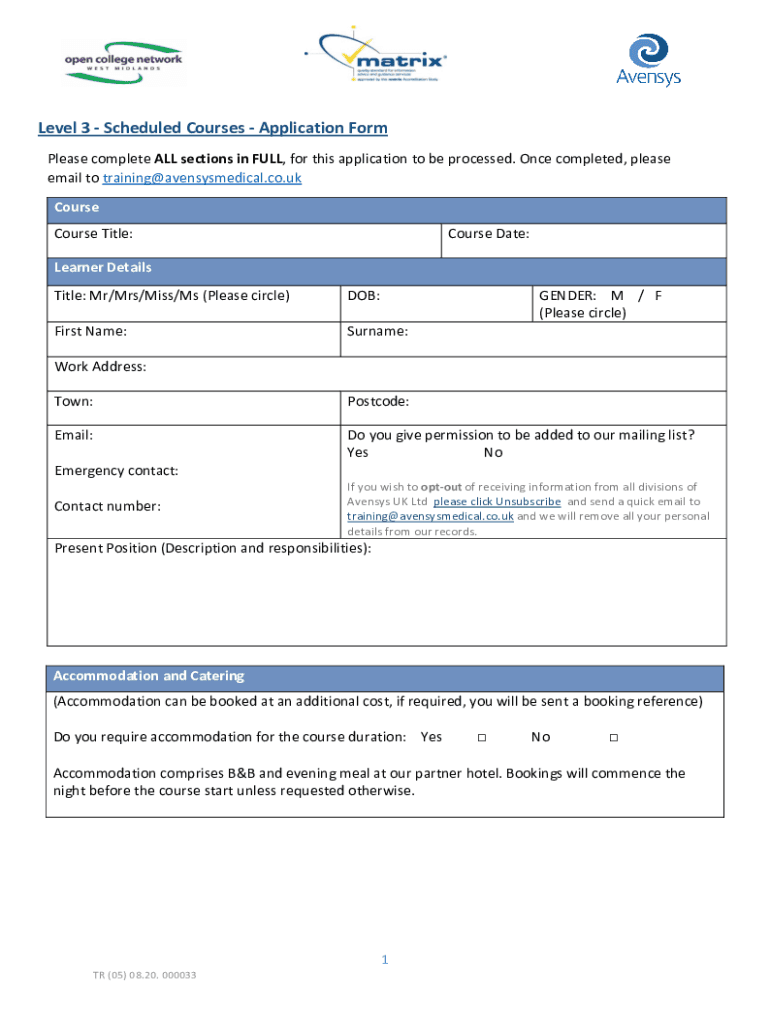 Level 3 Scheduled Courses Application Form Please complete ALL sections in FULL, for this application to be processed. Once completed, please email to training avensysmedical.co.UK Course Title:Course
