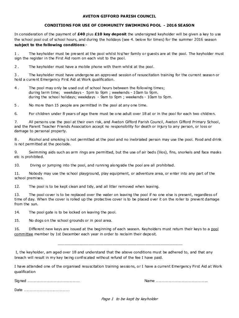 VETO GIFFORD PARISH COUNCIL CONDITIONS FOR USE OF COMMUNITY SWIMMING POOL 2016 SEASON In consideration of the payment of 40 plus 10 key deposits the undersigned keyholder will be given a key to use