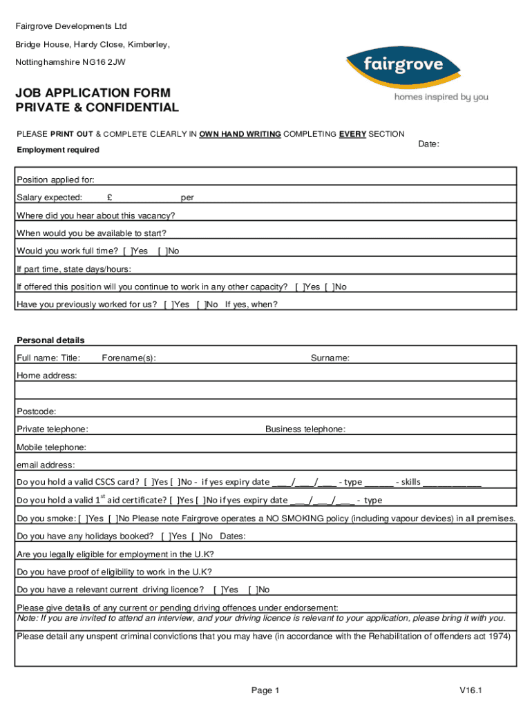 Fair grove Developments Ltd Bridge House, Hardy Close, Kimberley, Nottingham shire NG16 2JWJOB APPLICATION FORM PRIVATE & CONFIDENTIAL PLEASE PRINT OUT & COMPLETE CLEARLY IN OWN Handwriting COMPLETING