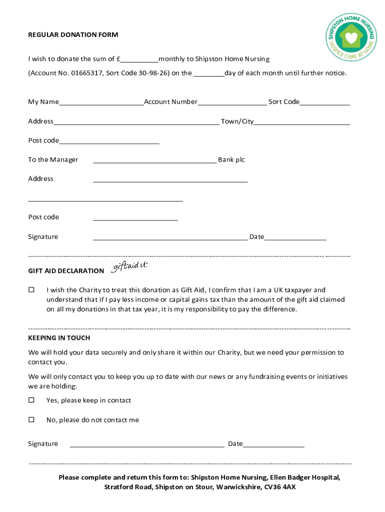 REGULAR DONATION FORM I wish to donate the sum of monthly to Ships ton Home Nursing (Account No. 01665317, Sort Code 309826) on the day of each month until further notice. My Name Account Number Sort