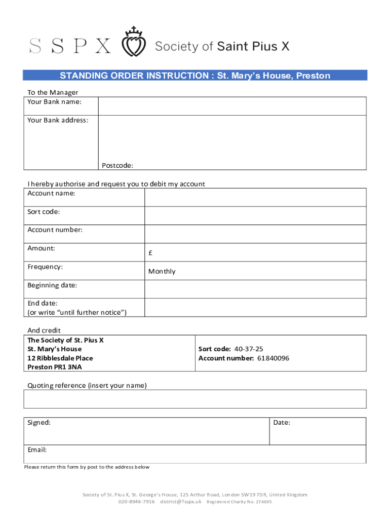 STANDING ORDER INSTRUCTION : St. Mary's House, Preston To the ManagerYour Bank name:Your Bank address:Postcode:I hereby authorize and request you to debit my accountAccount name:Sort code:Account