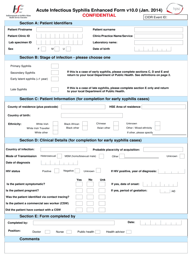 The Acute Infectious Syphilis Enhanced Form is a critical tool for reporting cases of acute infectious syphilis in Ireland. This form serves as an essential component in public health monitoring, as it facilitates the collection of important data on the incidence and spread of the disease. Accurate reporting of syphilis cases plays a pivotal role in shaping public health initiatives and resource allocation.