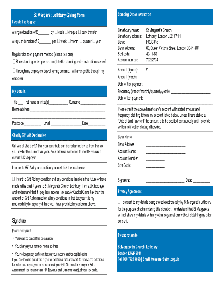 Standing Order Instructions Margaret Lottery Giving Form I would like to give: A single donation of A regular donation of bycashperweekcheque month bank transfer quarteryearRegular donation payment