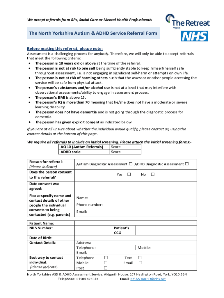 We accept referrals from GP's, Social Care or Mental Health Professionals North Yorkshire Autism & ADHD Service Referral Form Before making this referral, please note: Assessment is a challenging