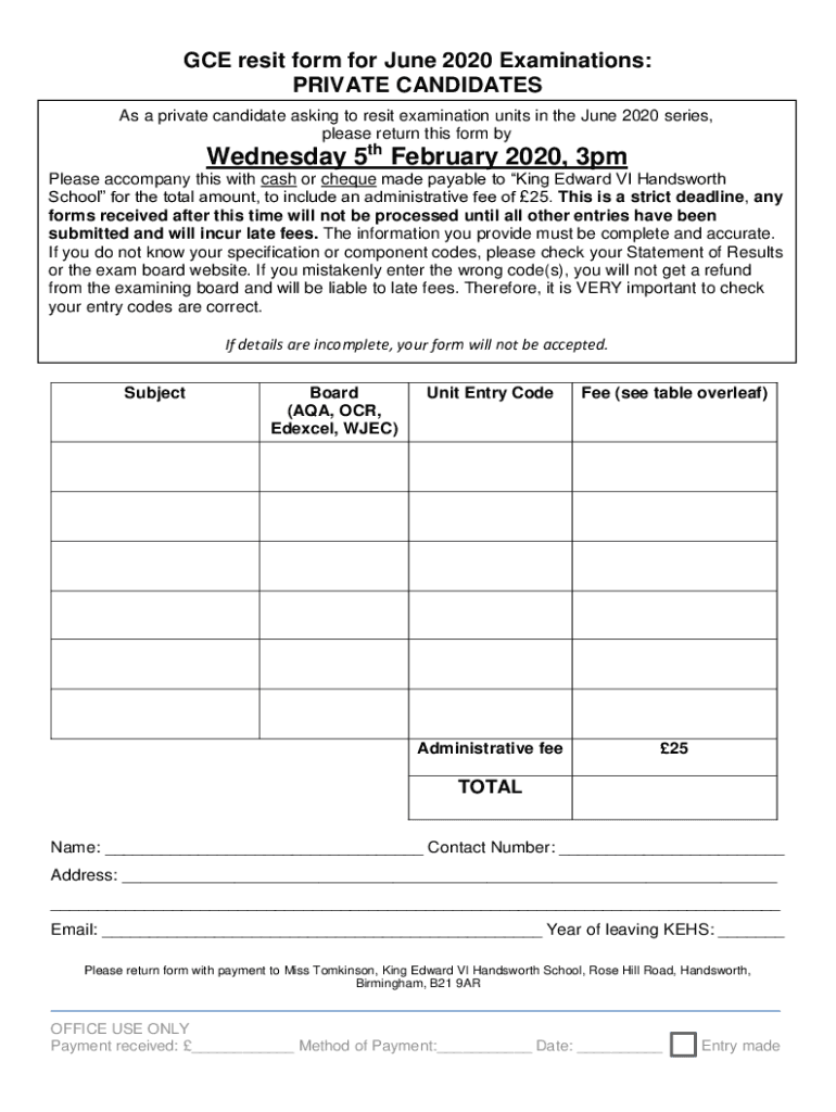 As a private candidate asking to resit examination units in the June 2020 series,