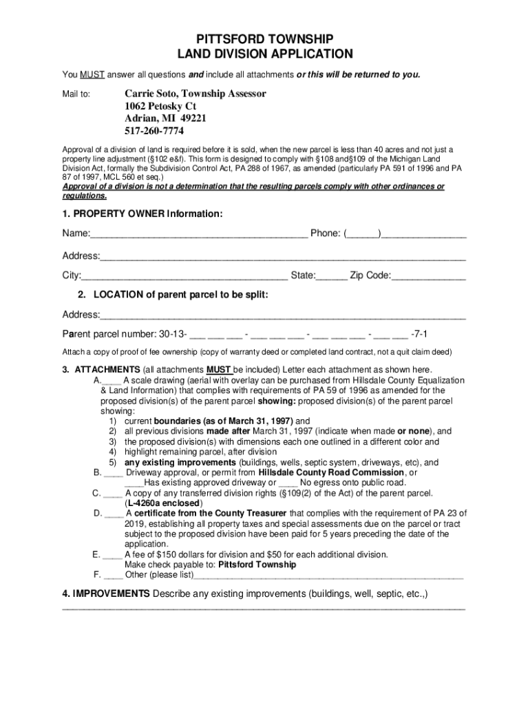 PICKFORD TOWNSHIP LAND DIVISION APPLICATION You MUST answer all questions and include all attachments or this will be returned to you. Mail to:Carrie Soto, Township Assessor 1062 Pesky Ct Adrian,