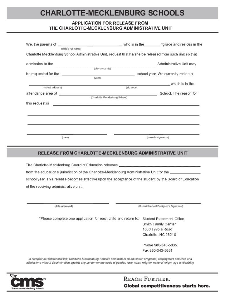 Get the free APPLICATION FOR RELEASE FROM THE CHARLOTTE-MECKLENBURG ...