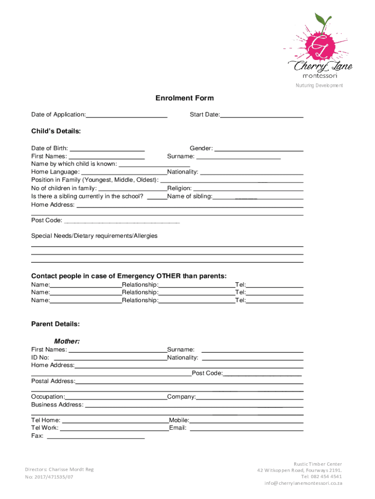 Nurturing DevelopmentEnrolment Form Date of Application:Start Date:Child's Details: Date of Birth: First Names: Name by which child is known: Home Language: Position in Family (Youngest, Middle, Oldest):