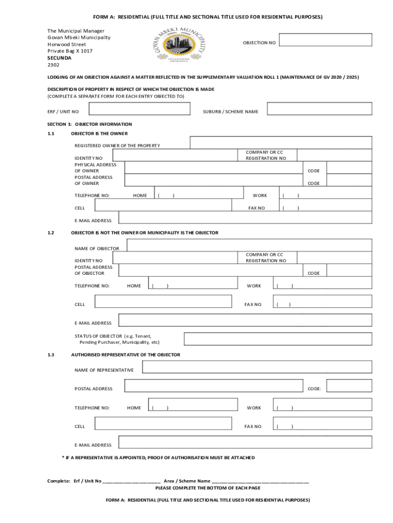 FORM A: RESIDENTIAL (FULL TITLE AND SECTIONAL TITLE USED FOR RESIDENTIAL PURPOSES)