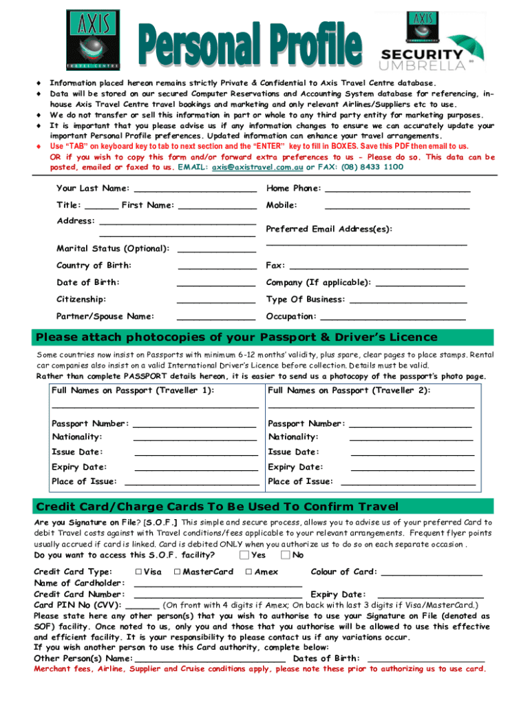Information placed hereon remains strictly Private & Confidential to Axis Travel Center database. Data will be stored on our secured Computer Reservations and Accounting System database for referencing,