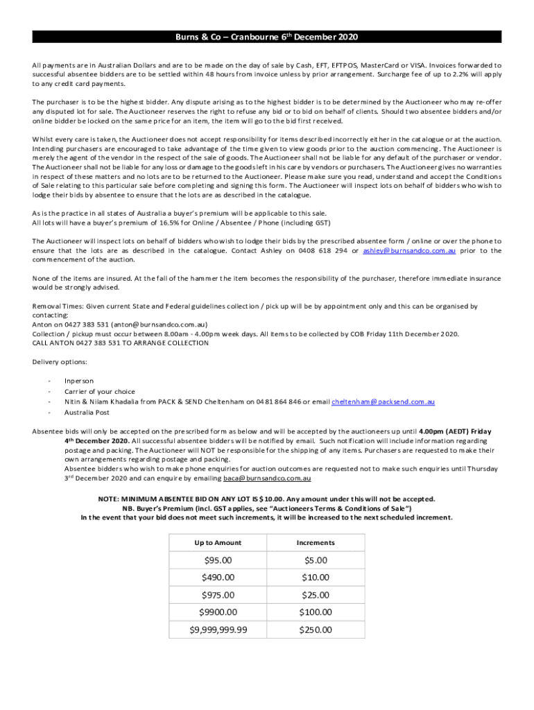 Burns & Co Claiborne 6th December 2020 All payments are in Australian Dollars and are to be made on the day of sale by Cash, EFT, EFTPOS, MasterCard or VISA. Invoices forwarded to successful absentee