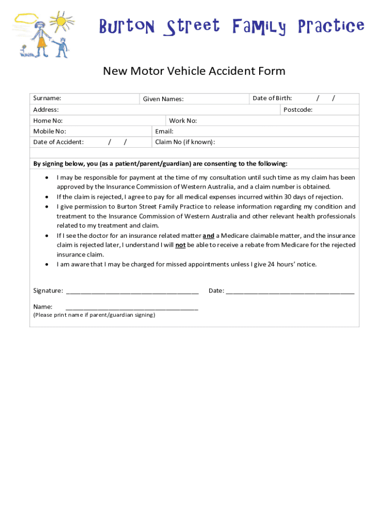 Burton Street Family Practice New Motor Vehicle Accident Form Surname:Date of Birth:Given Names:Address://Postcode:Home No:Work No:Mobile No: Date of Accident:Email: //Claim No (if known):By signing