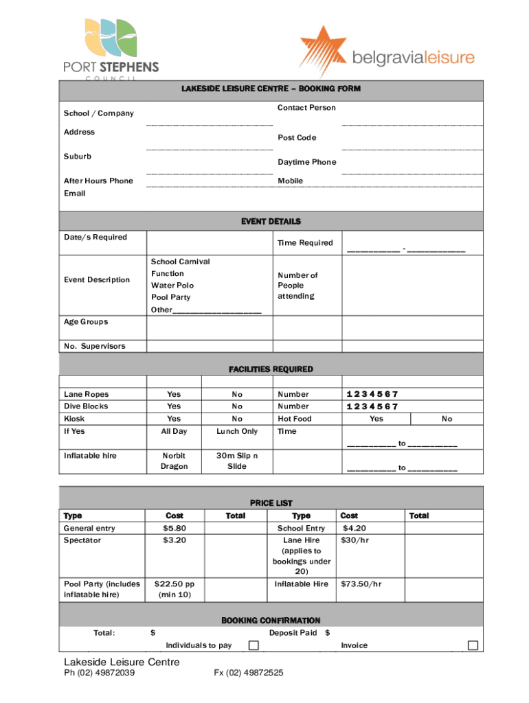 LAKESIDE LEISURE Center BOOKING FORM Contact Personhood / Company Address Post CodeSuburbDaytime Thereafter Hours Phone EmailMobileEVENT DETAILS Date/s Requirement DescriptionTime Required School