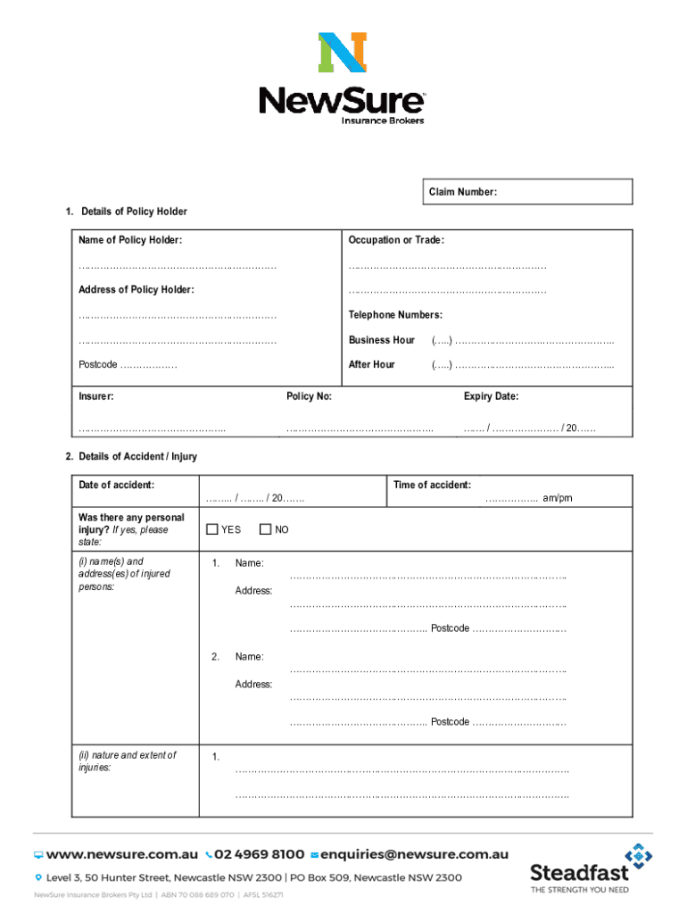 Claim Number: 1. Details of policyholder Name of policyholder:Occupation or Trade:Address of policyholder:Telephone Numbers:Business Hour(.)