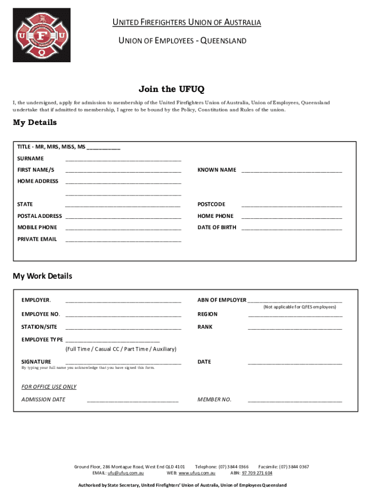 Anyone who wishes to become a member of the www.ufuq.com.au can fill out the new members application. This application is for individuals who want to join the United Firefighters Union of Queensland (UFUQ). It is open to firefighters, firefighters' family members, and individuals who support the union's mission and goals.