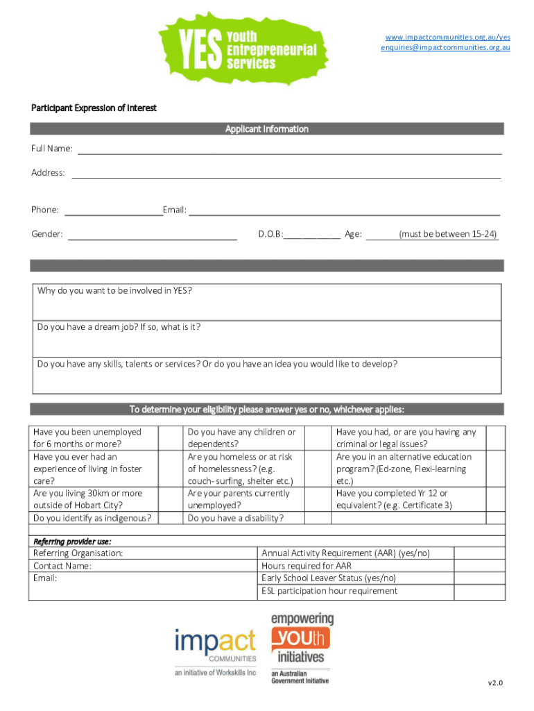 WWW.impactcommunities.org.au/yes inquiries impact communities.org.participant Expression of Interest Applicant Information Full Name: Address:Email:Phone:D.O.B: Age:Gender:(must be between 1524)Why