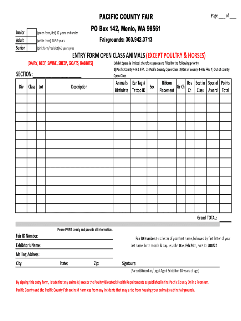 PACIFIC COUNTY FAIR Junior Adult Senior(green form/dot) 17 years and underage of PO Box 142, Men lo, WA 98561 Fairgrounds: 360.942.3713(white form) 1859 years (pink form/red dot) 60 years presently