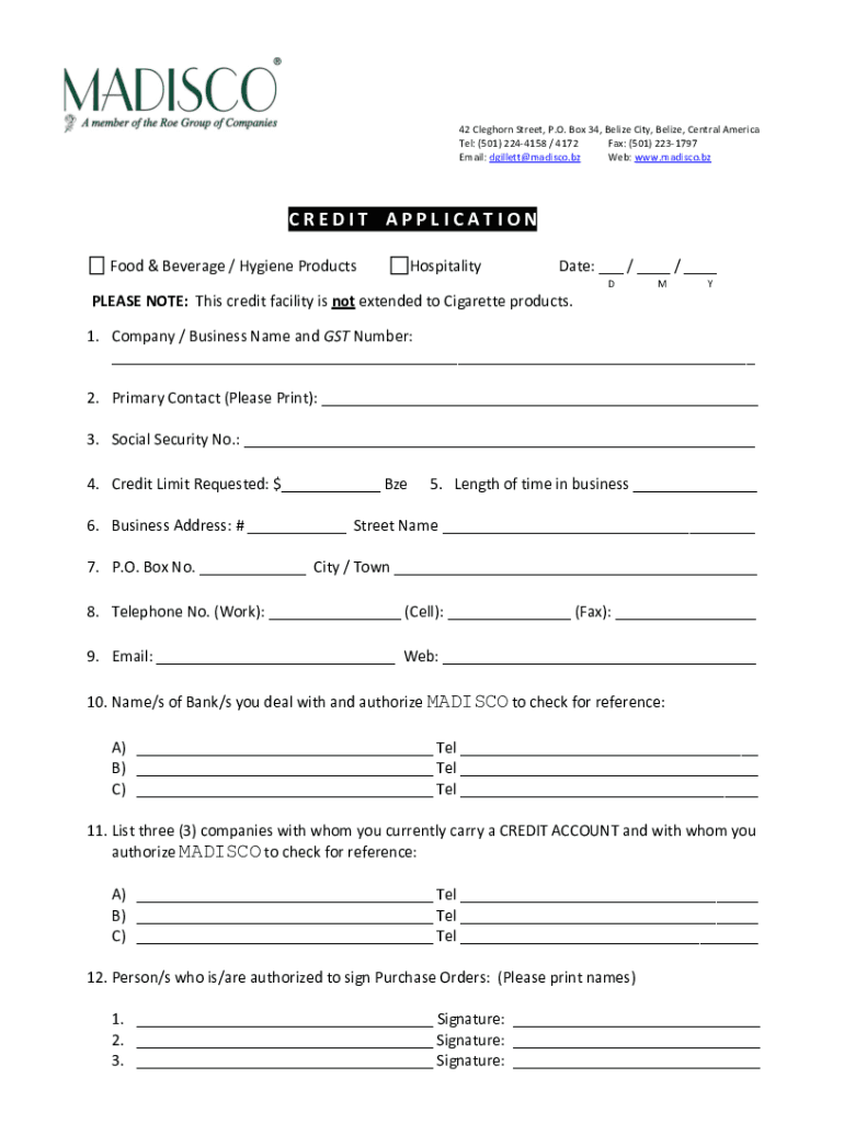 42 Leghorn Street, P.O. Box 34, Belize City, Belize, Central America Tel: (501) 2244158 / 4172 Fax: (501) 2231797 Email: Gillett madisco. By Web: www.madisco.bzCREDIT APPLICATION Food & Beverage /