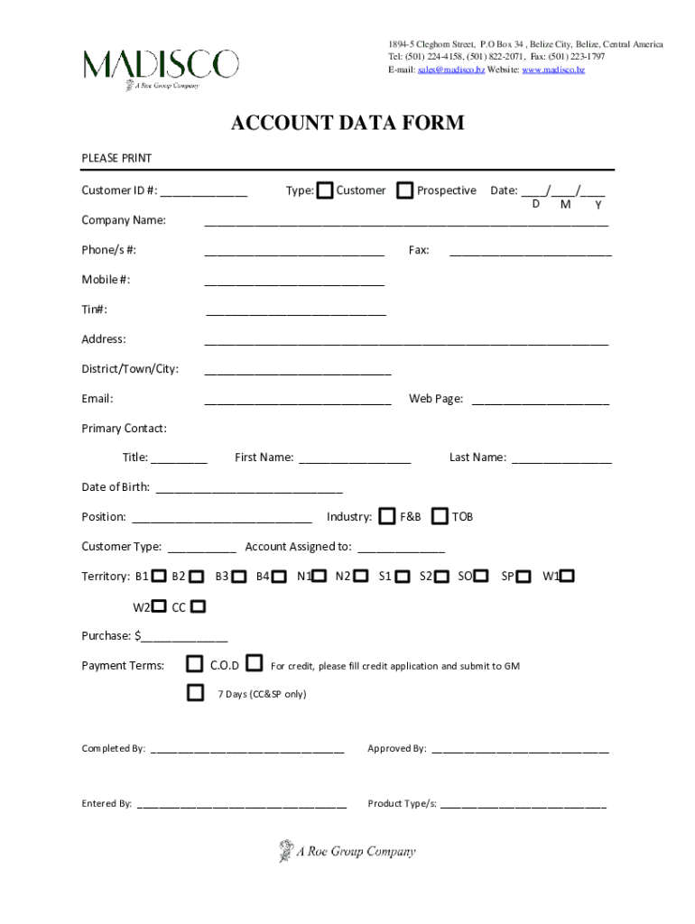 18945 Leghorn Street, P. O Box 34, Belize City, Belize, Central America Tel: (501) 2244158, (501) 8222071, Fax: (501) 2231797 Email: sales madisco. By Website: www.madisco.bzACCOUNT DATA FORM PLEASE