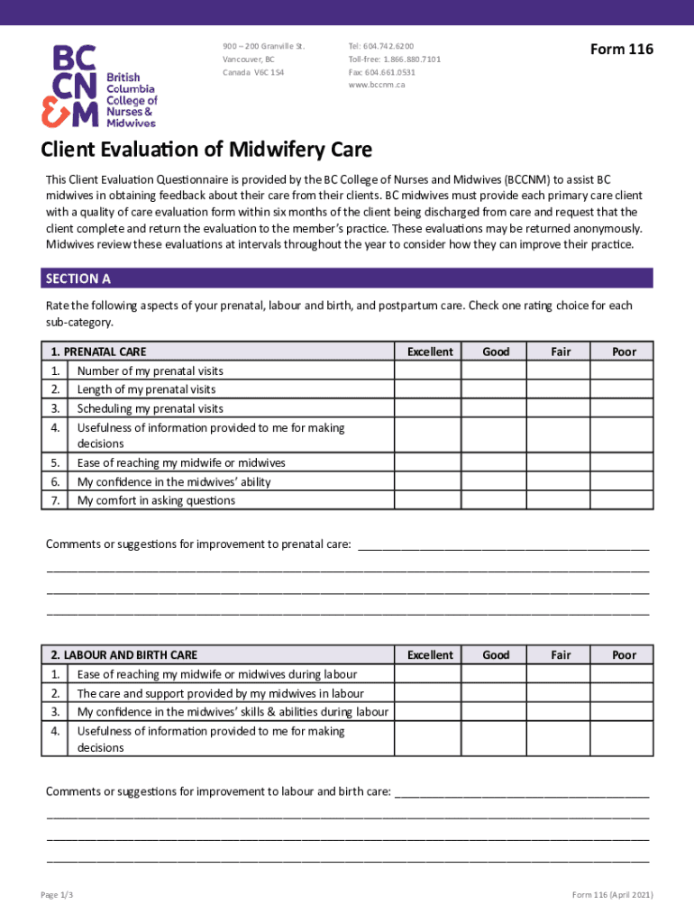 900 200 Granville St. Vancouver, BC Canada V6C 1S4Form 116Tel: 604.742.6200 Toll free: 1.866.880.7101 Fax: 604.661.0531 www.bccnm.caClient Evaluation of Midwifery Care This Client Evaluation Questionnaire