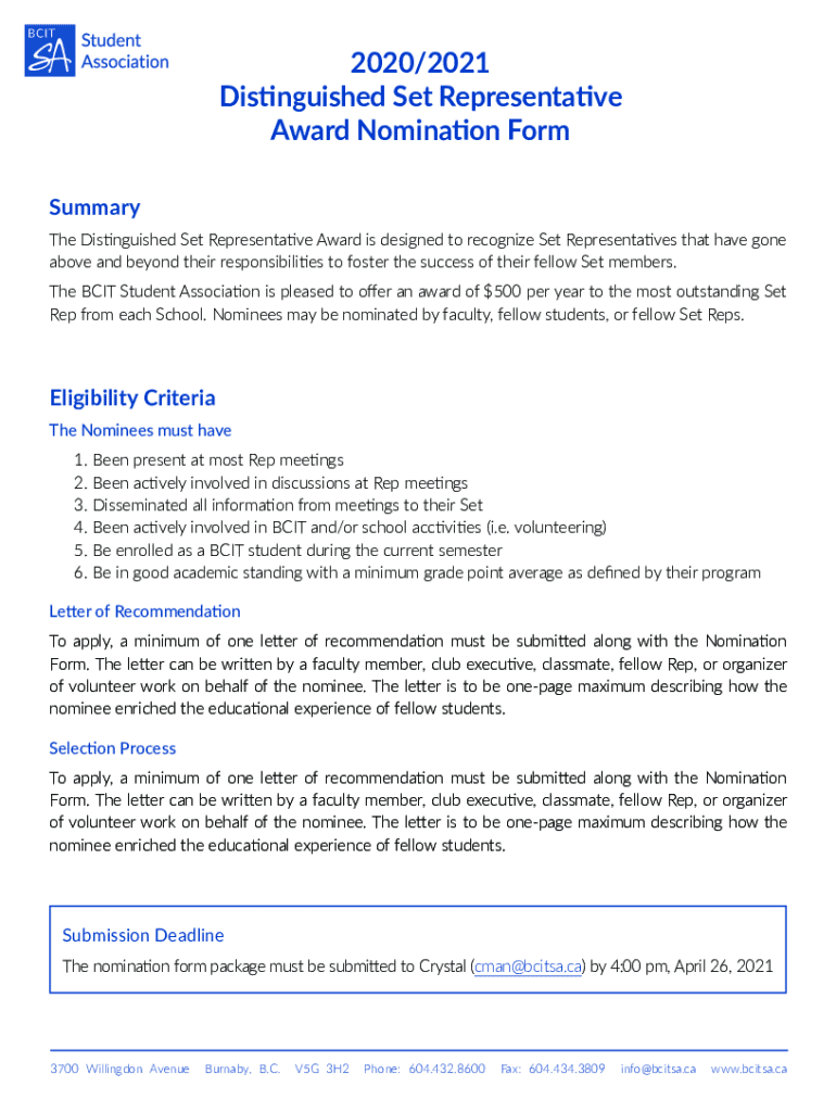 Get the free 2020/2021 Distinguished Set Representative Award Nomination Form