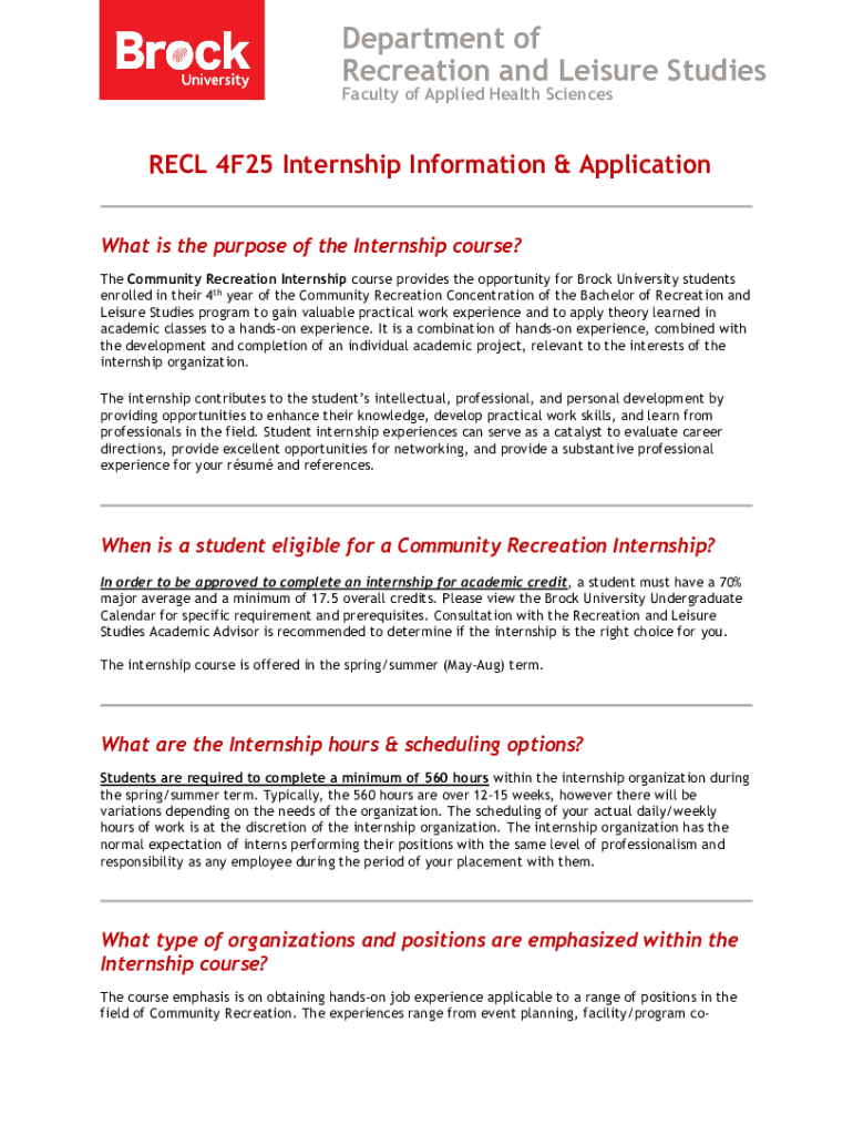 Department of Recreation and Leisure Studies Faculty of Applied Health ScienceDirect 4F25 Internship Information & Application What is the purpose of the Internship course? The Community Recreation