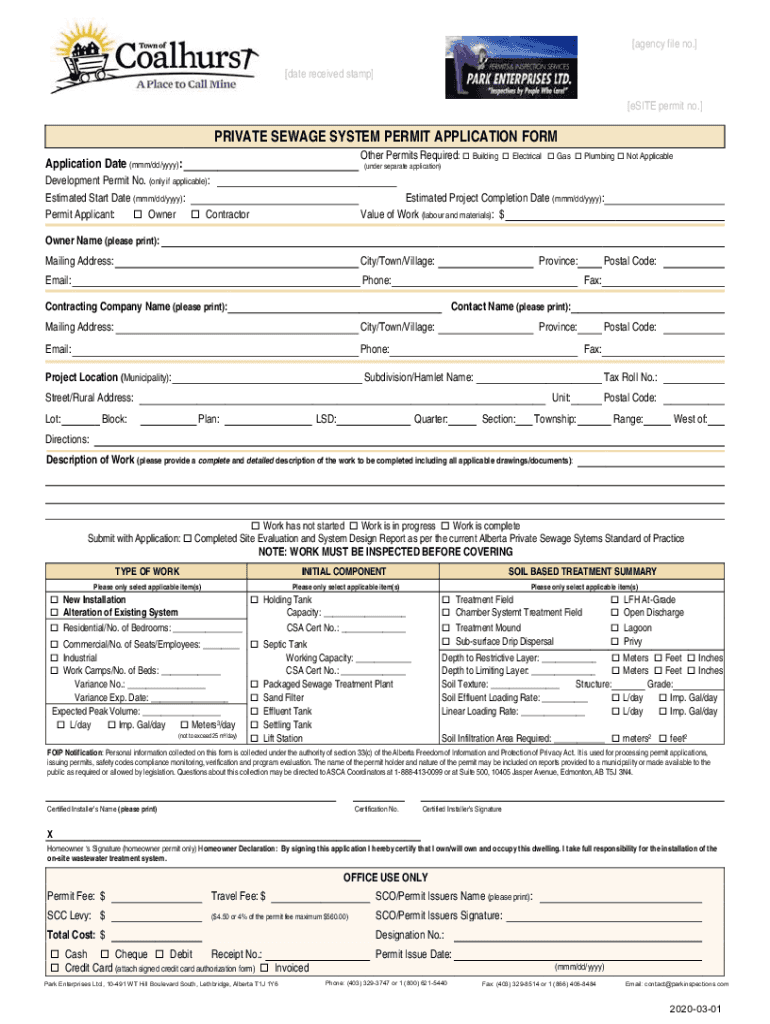 Agency file no. date received stamp site permit no. PRIVATE SEWAGE SYSTEM PERMIT APPLICATION FORM Other Permits Required: BuildingApplication Date (MMM/dd/YYY):(under separate application) Electrical