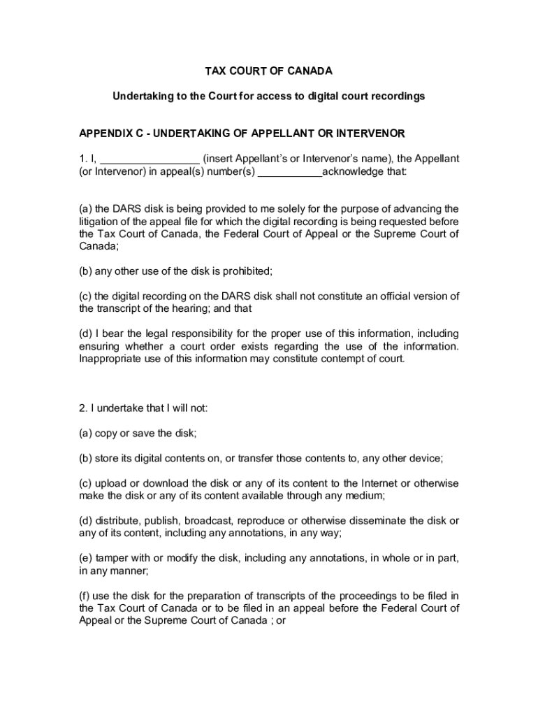 TAX COURT OF CANADA Undertaking to the Court for access to digital court recordings APPENDIX C UNDERTAKING OF APPELLANT OR INTERVENE 1. I, (insert Appellants or Intervenes name), the Appellant (or