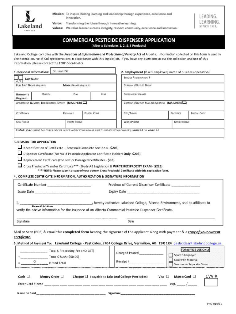 COMMERCIAL PESTICIDE DISPENSER APPLICATION (Alberta Schedules 1, 2, & 3 Products) Lakeland College complies with the Freedom of Information and Protection of Privacy Act of Alberta. Information collected