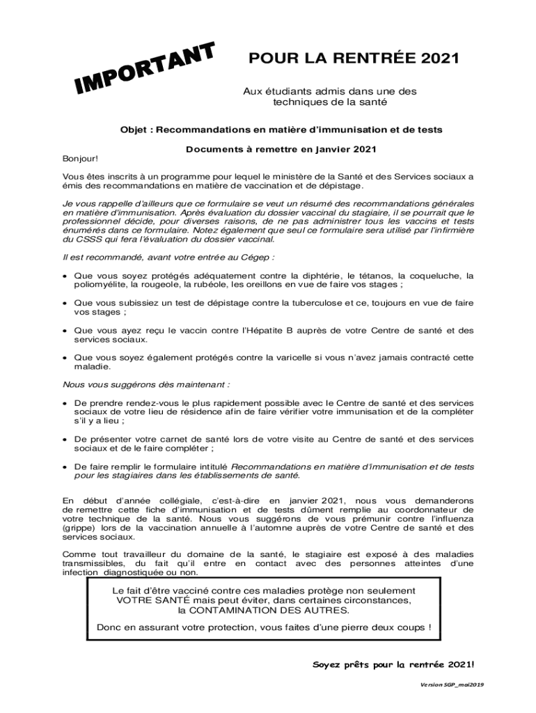 POUR LA RENT RE 2021 Aux students admit days one DES techniques DE la sent Object : Recommendations en mature immunization et de tests Documents resettle en Janvier 2021 Bonjour! Vows TES inserts